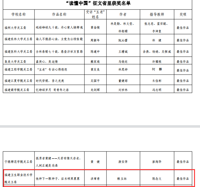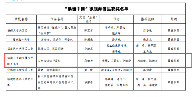 近日,福建省教育系統(tǒng)關(guān)工委公布了2022年“讀懂中國(guó)”活動(dòng)評(píng)審結(jié)果。本次省教育關(guān)工委共評(píng)選最佳征文10篇,優(yōu)秀征文47篇,最佳微視頻6個(gè),優(yōu)秀微視頻20個(gè)。我系選送的微視頻《人生應(yīng)該這樣度過(guò)》獲評(píng)福建省教育關(guān)工委2022年“讀懂中國(guó)”活動(dòng)微視頻最佳作品;選送的3篇征文均獲佳績(jī),征文《他種下一顆種子,后來(lái)碩果累累》獲評(píng)最佳作品,《講臺(tái)載偉業(yè),燭光照山河》《退休不褪色,余熱映初心》兩篇征文獲評(píng)優(yōu)秀作品。