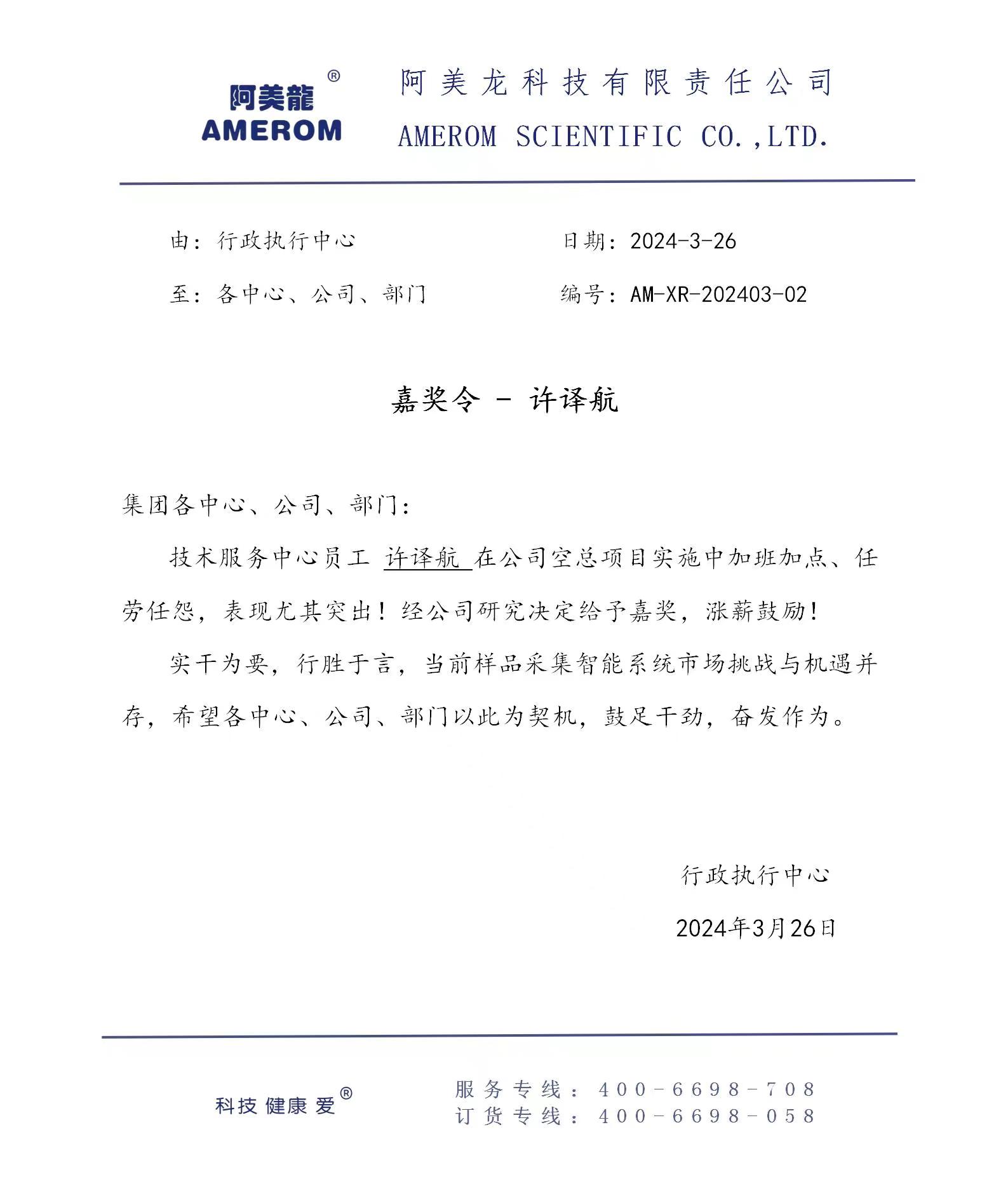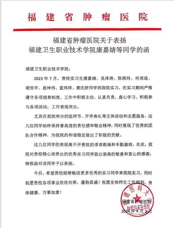 近日,我院收到福建省腫瘤醫(yī)院和阿美龍科技有限責任公司對實習生的表揚信,信中對2021級康嘉靖、吳澤濤、謝恒宇、翁坤煒、藍煒祥、黃沈妍、許譯航等七名同學在實習過程中嚴格遵守各項規(guī)章制度,勤奮工作、虛心好學、任勞任怨,積極參與各項活動,工作表現(xiàn)突出。