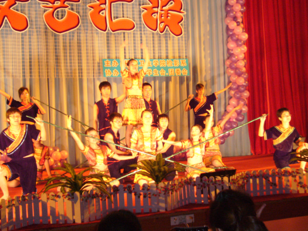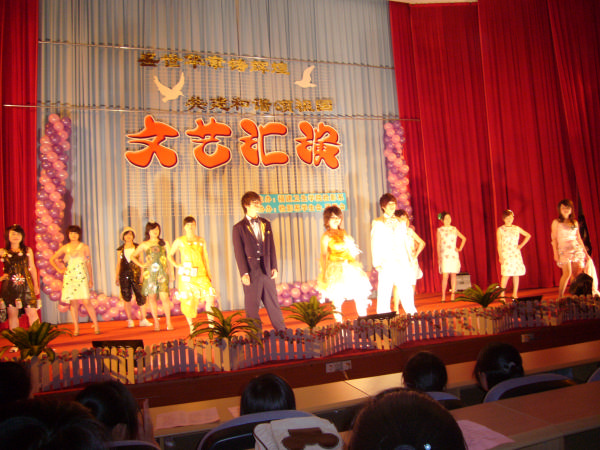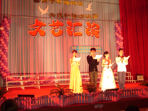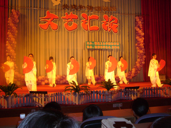 晚上6:30, 一曲《十送紅軍》正式拉開(kāi)文藝晚會(huì)的序幕。今年是建國(guó)60周年,六十年風(fēng)雨兼程鑄就強(qiáng)盛的中國(guó),六十載勵(lì)精圖治共創(chuàng)世紀(jì)的輝煌,《十送紅軍》情真意切,唱出了軍民魚水情。整臺(tái)晚會(huì)節(jié)目新穎多樣、內(nèi)容積極向上,學(xué)術(shù)廳里無(wú)不洋溢著歡樂(lè)的氣氛。有剛勁有力的功夫扇《中國(guó)功夫》,舞姿翩翩的扇子舞《青花瓷》、樸素灑脫的苗族竹竿舞和火暴的勁舞《No Body》。相聲《庸醫(yī)》、小品《我像誰(shuí)》、《梁?!凡粫r(shí)引起場(chǎng)下陣陣笑聲。歌曲串燒《歌舞青春》、男女合唱《流星下的愿》、獨(dú)唱《他不愛(ài)我》、歌伴舞《說(shuō)唱臉譜》也為晚會(huì)增色不少。傳統(tǒng)中國(guó)茶藝表演《茶韻》、環(huán)保時(shí)裝走秀《Over the rainbow》、氣勢(shì)磅礴的詩(shī)朗誦《這片山河,這個(gè)時(shí)代》將氣氛一次又一次地推向高潮。最后,晚會(huì)在健美操《Trance Mix》中落下了帷幕。
