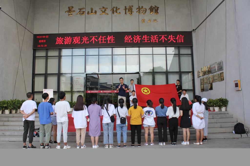 活動伊始,同學們在團總支副書記江鵬的帶領下莊嚴注視國旗,同唱國歌,大力弘揚以愛國主義為核心的偉大民族精神;同唱團歌,重溫入團誓詞,用朗朗誓言表達不忘初心、牢記使命擔當?shù)臎Q心。學生代表吳燦煌同學做國旗下的演講,用她極富感染力的聲音講述新中國70年來的風云變幻,述說新時代青年的使命和擔當。系團總支書記曾慶才為同學們開微團課,教導同學們要樹立好形象,要帶頭強信念、講政治、嚴自律,新時代的青年應有斗志,有作為,積極獻身到為同學服務的工作中去,做新時代青年的標桿。隨后同學們還參觀曇石山博物館,感受古人的智慧勞動,感嘆新生活的來之不易。