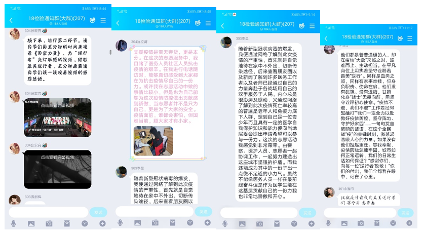 團支書組織同學們觀看《國家力量》為“逆行者”助威的視頻,致敬最美逆行者。在假期利用空余時間參與防疫志愿服務(wù)的志愿者們,也向大家分享自己在志愿服務(wù)過程中的感受與感悟,同學們紛紛為其點贊!張宏亮同學表示:“第一次在線上開團日感觸很深刻,抗疫醫(yī)務(wù)工作人員那種奮不顧身, 舍己為人的精神, 彰顯了醫(yī)者的使命與擔當, 是我們的學習榜樣!也體會到了大家對抗疫醫(yī)務(wù)工作人員那一股崇高的敬意和要向他們學習的精神。