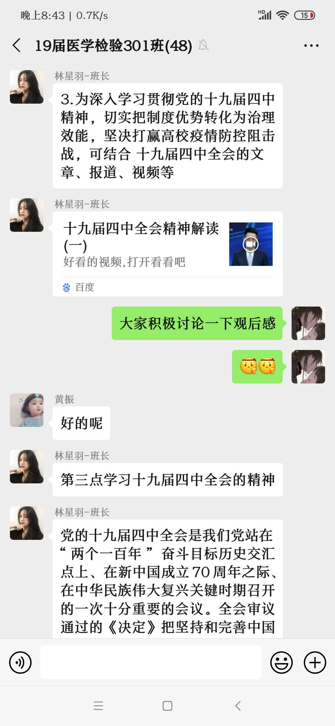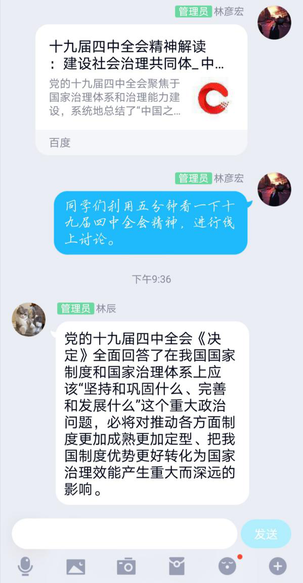 在各班團(tuán)支書(shū)的帶領(lǐng)下,全體團(tuán)員在各班群簽到,確認(rèn)所有人都在線(xiàn)參與此次活動(dòng),并在線(xiàn)上齊唱國(guó)歌、團(tuán)歌。各班團(tuán)支書(shū)組織團(tuán)員觀看十九屆四中全會(huì)精神的相關(guān)資料、視頻和文章,同學(xué)們認(rèn)真學(xué)習(xí)領(lǐng)會(huì)十九屆四中全會(huì)精神,大家暢所欲言,紛紛發(fā)表對(duì)于十九屆四中全會(huì)精神的心得體會(huì)。通過(guò)回答問(wèn)題的形式,促進(jìn)同學(xué)們對(duì)十九屆四中全會(huì)精神的認(rèn)識(shí),為團(tuán)日的結(jié)束劃上了完美的句號(hào)。線(xiàn)上學(xué)習(xí),做到理論學(xué)習(xí)不斷線(xiàn),凝聚起攜手戰(zhàn)疫的強(qiáng)大青春力量!