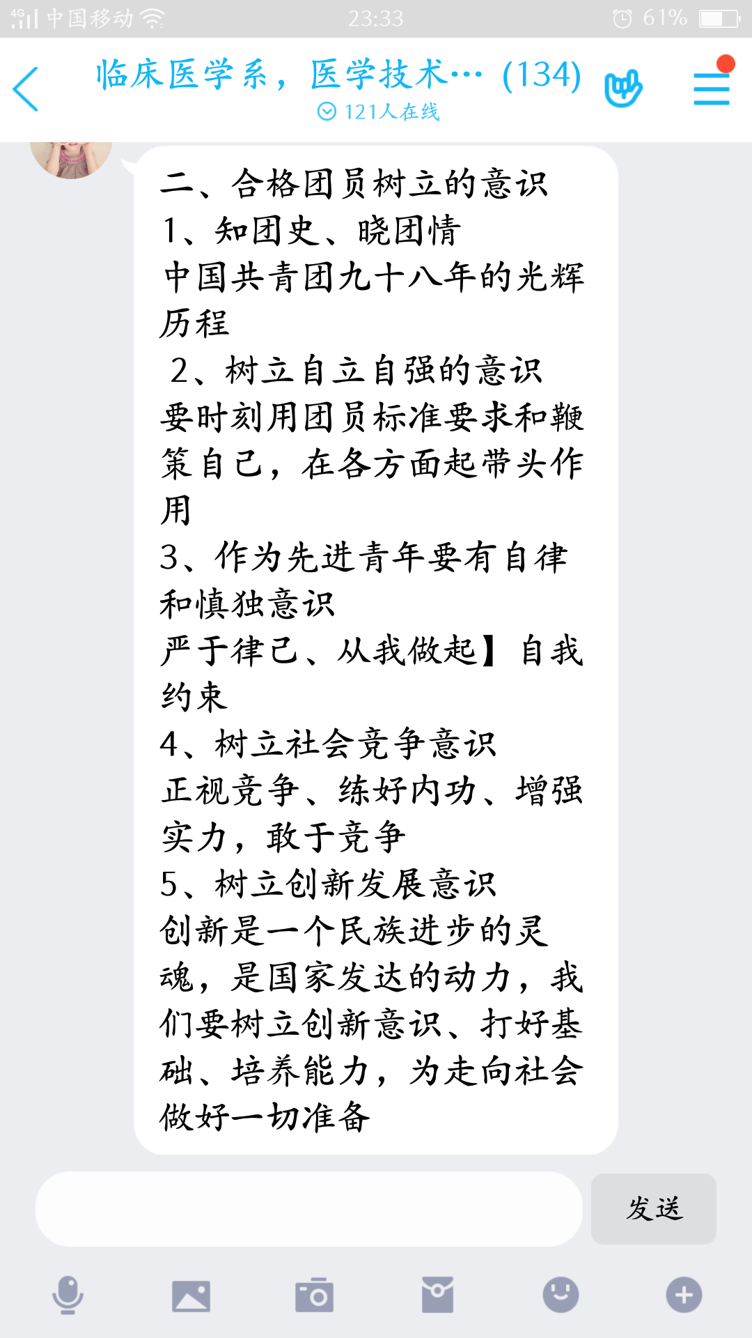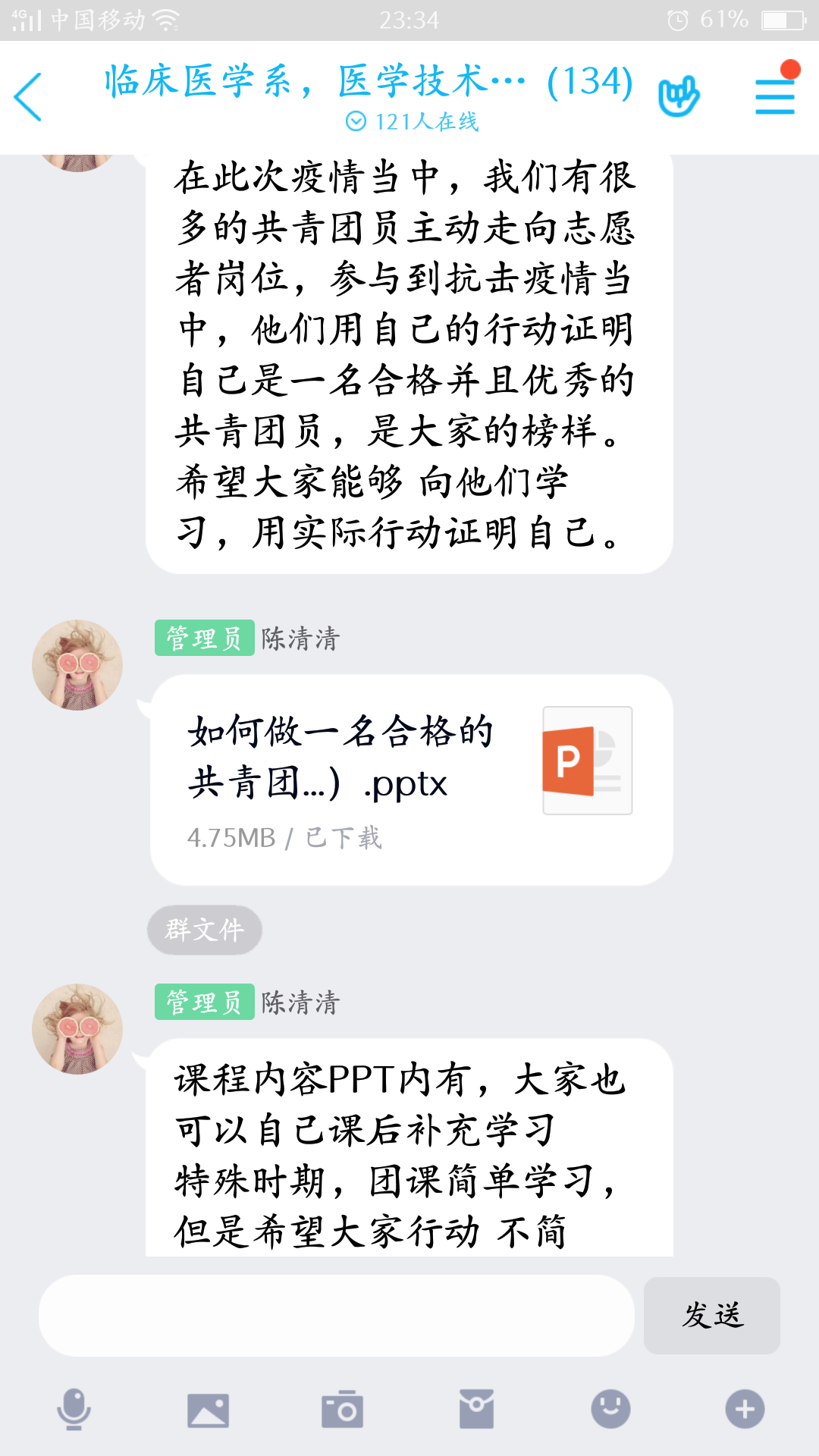 2020年3月12日晚上,醫(yī)學技術系、臨床醫(yī)學系通過QQ平臺進行線上“醫(yī)學技術系第十期、臨床醫(yī)學系第十一期業(yè)余分團?!钡谌n。臨床醫(yī)學系團總支書記陳清清老師以“如何做一名合格的共青團員”為主題進行授課。此次團課圍繞“對共青團的認識”、“做一名合格團員應該樹立的意識”、“怎樣做一名合格的共青團員”三個部分展開。