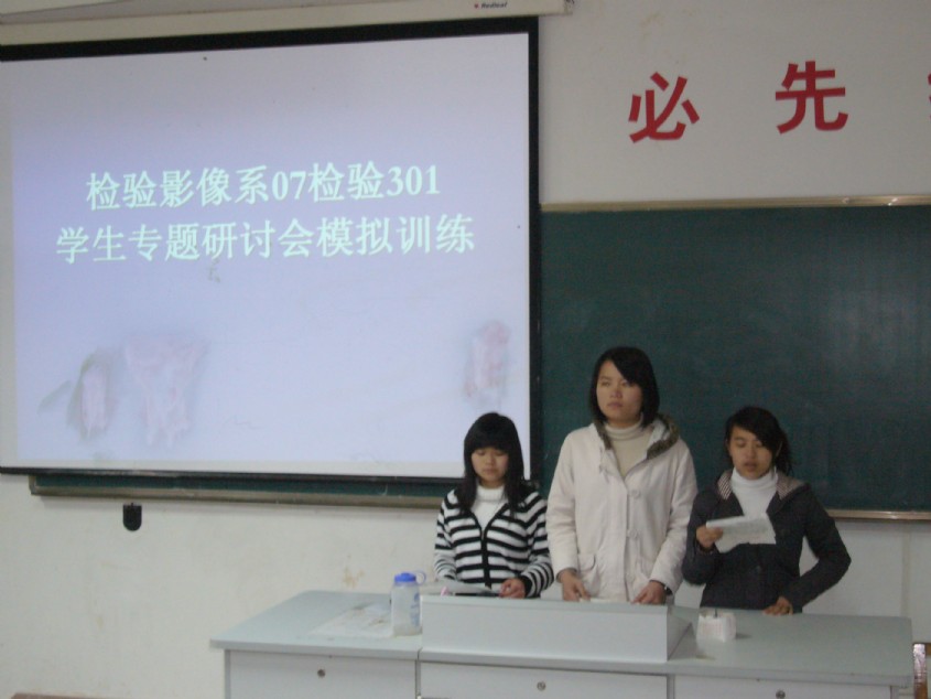 經(jīng)過前一階段專題研討的普訓(xùn),大專班學(xué)生在寫作水平、表達能力和心理素質(zhì)上都有了不同程度的提高。為了進一步增強大專班同學(xué)的專題研討能力,4月1日下午,檢驗影像系組織學(xué)生開始進行分組模擬訓(xùn)練。此次訓(xùn)練的題目是“業(yè)精德誠”,同學(xué)們圍繞著“業(yè)”與“德”兩個方面,從不同角度進行了闡述。