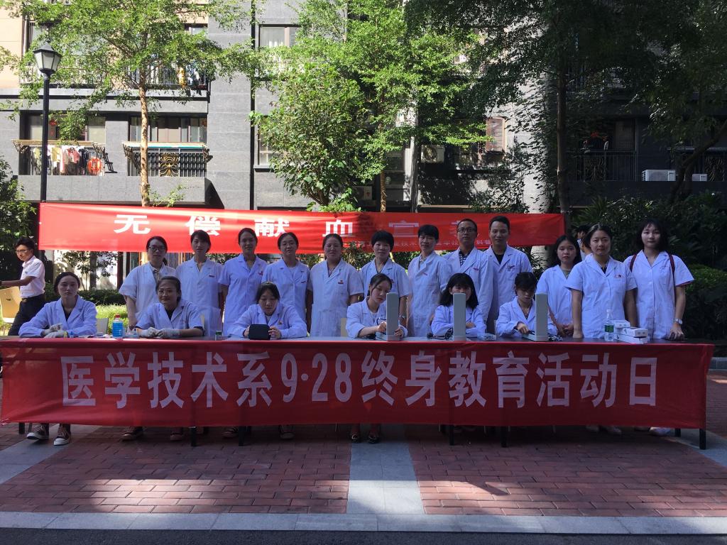 為做好2019年“9.28終身教育活動(dòng)日”暨全民終身學(xué)習(xí)活動(dòng)周,宣傳終身教育思想,樹立終身學(xué)習(xí)理念,激勵(lì)終身學(xué)習(xí)熱情,充分發(fā)揮醫(yī)學(xué)職業(yè)技能優(yōu)勢(shì),突出我院辦學(xué)特色和成果,進(jìn)一步加強(qiáng)基層服務(wù)型黨組織建設(shè),充分發(fā)揮黨員模范帶頭作用,醫(yī)學(xué)技術(shù)系黨總支于2019年9月19日下午2點(diǎn)在閩侯世茂小區(qū),結(jié)合“不忘初心、牢記使命”主題教育,緊貼人民群眾需求和當(dāng)?shù)貙?shí)際,開展無(wú)償獻(xiàn)血宣教活動(dòng),15名黨員教師和20名學(xué)生參與了此次活動(dòng)。