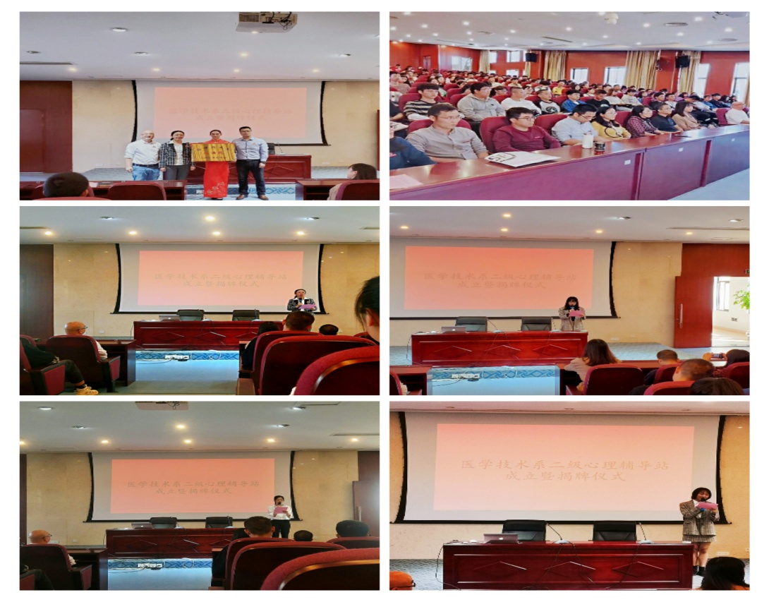 最后,由學(xué)院黃銘珊副院長(zhǎng)、健康管理系黨總支書記艾松軍、醫(yī)學(xué)技術(shù)系黨總支負(fù)責(zé)人邱滾忠為系部二級(jí)心理輔導(dǎo)站成立進(jìn)行揭牌儀式。