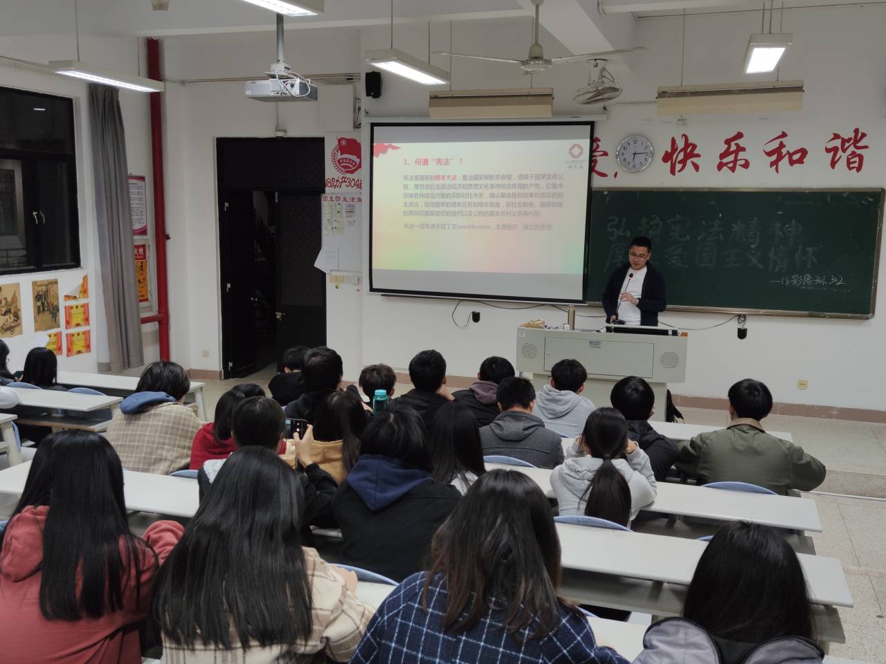 不同以往,此次主題班會特別邀請了上海錦天城(福州)律師事務所的湯少彬律師為同學講授憲法的知識,湯律師通過一個個發(fā)生在身邊的真實故事,生動地講解什么是憲法、憲法的作用、憲法能帶來什么好處以及憲法與愛國精神的關系等內容。同學們認真專注聽講,湯律師生動詼諧的語言不時引起全場的掌聲,取得很大的反響。