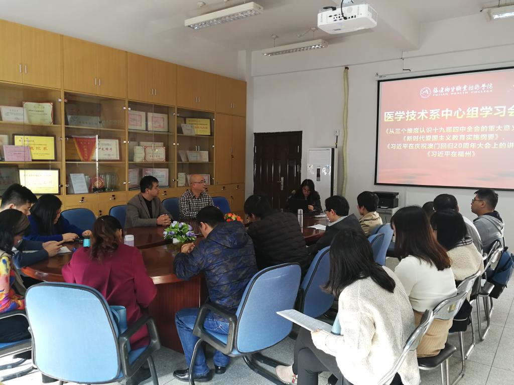2019年12月25日, 醫(yī)學(xué)技術(shù)系在系部樓301召開中心組學(xué)習(xí)(擴(kuò)大)會(huì)議,學(xué)習(xí)《從三個(gè)維度認(rèn)識(shí)十九屆四中全會(huì)的重大意義》、《新時(shí)代愛國(guó)主義教育實(shí)施綱要》、《習(xí)近平在福州》、《習(xí)近平在慶祝澳門回歸20周年大會(huì)上的講話》精神,會(huì)議由系黨總支負(fù)責(zé)人邱滾忠同志主持。