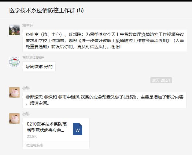 醫(yī)學(xué)技術(shù)系防控工作領(lǐng)導(dǎo)小組及時(shí)傳達(dá)和學(xué)習(xí)有關(guān)通知精神,研究制定《醫(yī)學(xué)技術(shù)系防范新型冠狀病毒應(yīng)急預(yù)案》,每日通報(bào)系部師生健康情況。