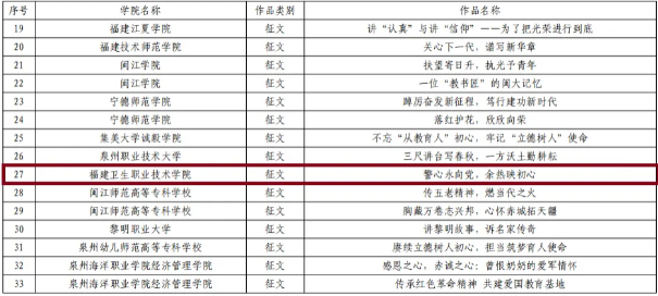 近日,福建省教育廳關(guān)工委通報(bào)2023年“讀懂中國(guó)”活動(dòng)作品評(píng)審結(jié)果,我校關(guān)工委獲全國(guó)優(yōu)秀組織獎(jiǎng),我選送的《警心永向黨,余熱映初心》獲評(píng)全省最佳征文作品,《捧出一顆丹心,獻(xiàn)與億兆生靈》、《勞模精神不褪色,鼓蕩丹心永綿延》獲評(píng)全省優(yōu)秀征文作品。