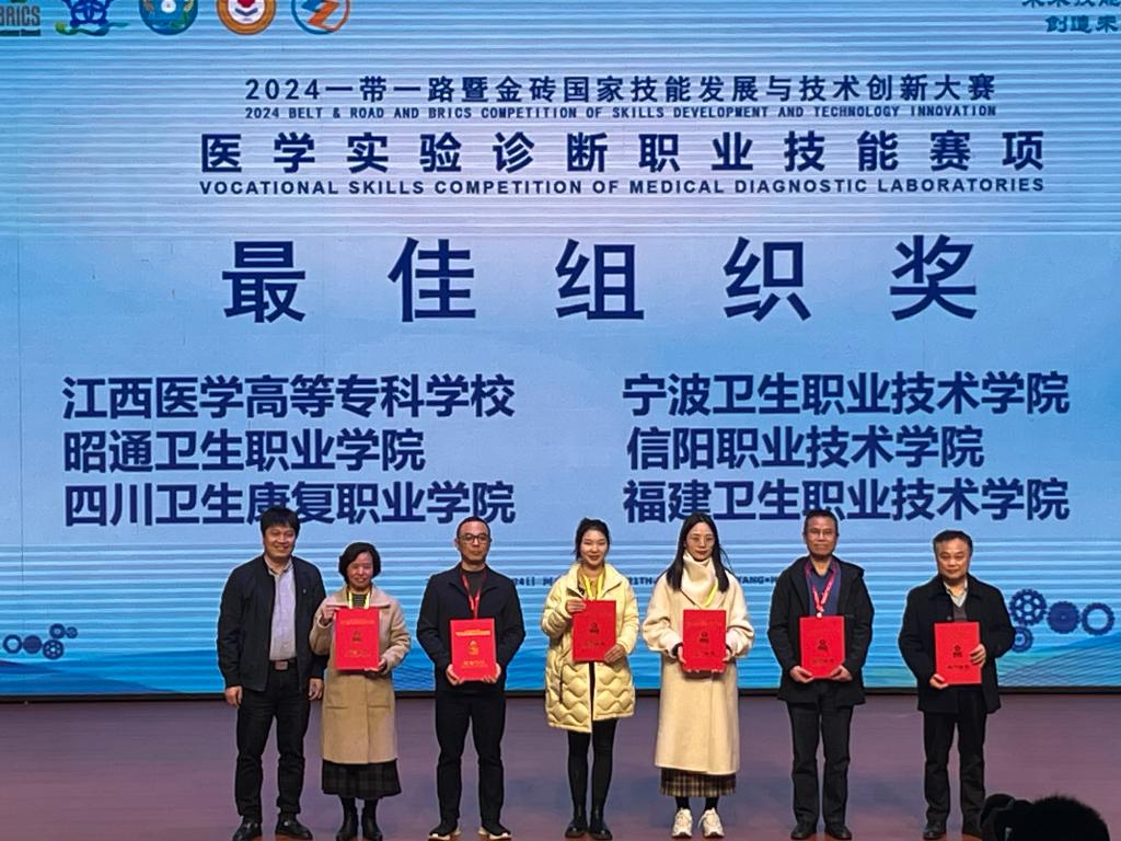 本次醫(yī)學(xué)實(shí)驗(yàn)診斷技能大賽,是全國(guó)醫(yī)學(xué)檢驗(yàn)教育教學(xué)專業(yè)的一次集中展示,也是行業(yè)集聚、專家學(xué)者匯聚的盛會(huì)。來(lái)自全國(guó)各地26個(gè)省市區(qū)的65個(gè)代表隊(duì)參賽,經(jīng)過(guò)兩天緊張有序的賽程,我校22檢驗(yàn)301吳婧欣、22檢驗(yàn)304沈靖嵐2位同學(xué)憑借扎實(shí)的專業(yè)知識(shí)與精湛的實(shí)操技能在眾多選手中脫穎而出,榮獲“團(tuán)體一等獎(jiǎng)”,我校榮獲“最佳組織獎(jiǎng)”。