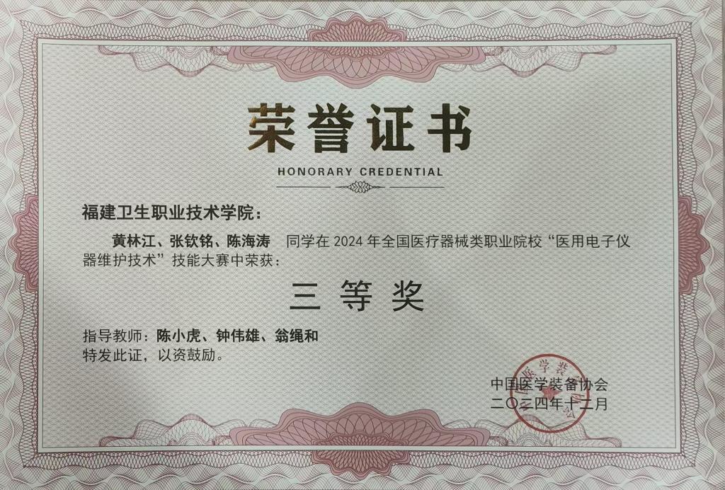 12月6日至9日,2024年全國醫(yī)療器械類職業(yè)院?!搬t(yī)用電子儀器維護技術”技能大賽在廣東食品藥品職業(yè)學院舉行。本次大賽共有來自全國各地30所醫(yī)療器械相關職業(yè)院校參賽,經過兩天的激烈角逐,我院醫(yī)用電子儀器技術專業(yè)學生黃林江、張欽銘和智能醫(yī)療裝備技術專業(yè)學生陳海濤在競賽中發(fā)揮出色,榮獲團體三等獎。