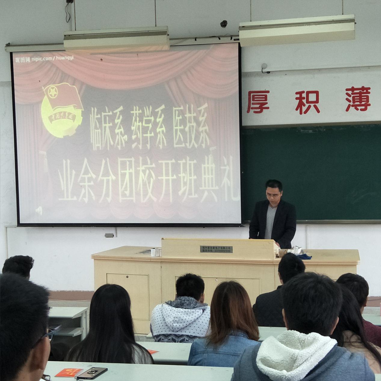 2017 39 ,由藥學(xué)系、臨床系、醫(yī)技系共同舉辦的業(yè)余分團(tuán)?;顒?dòng)在臨床系二階舉行開(kāi)班典禮。蒞臨本次大會(huì)的老師有:藥學(xué)系團(tuán)總支書(shū)記李寶珠老師、臨床醫(yī)學(xué)系團(tuán)總支書(shū)記葉家濤老師、醫(yī)學(xué)技術(shù)系團(tuán)總支書(shū)記楊盈老師、臨床系團(tuán)總支副書(shū)記陳清清老師、臨床醫(yī)學(xué)系黃惠龍老師。
