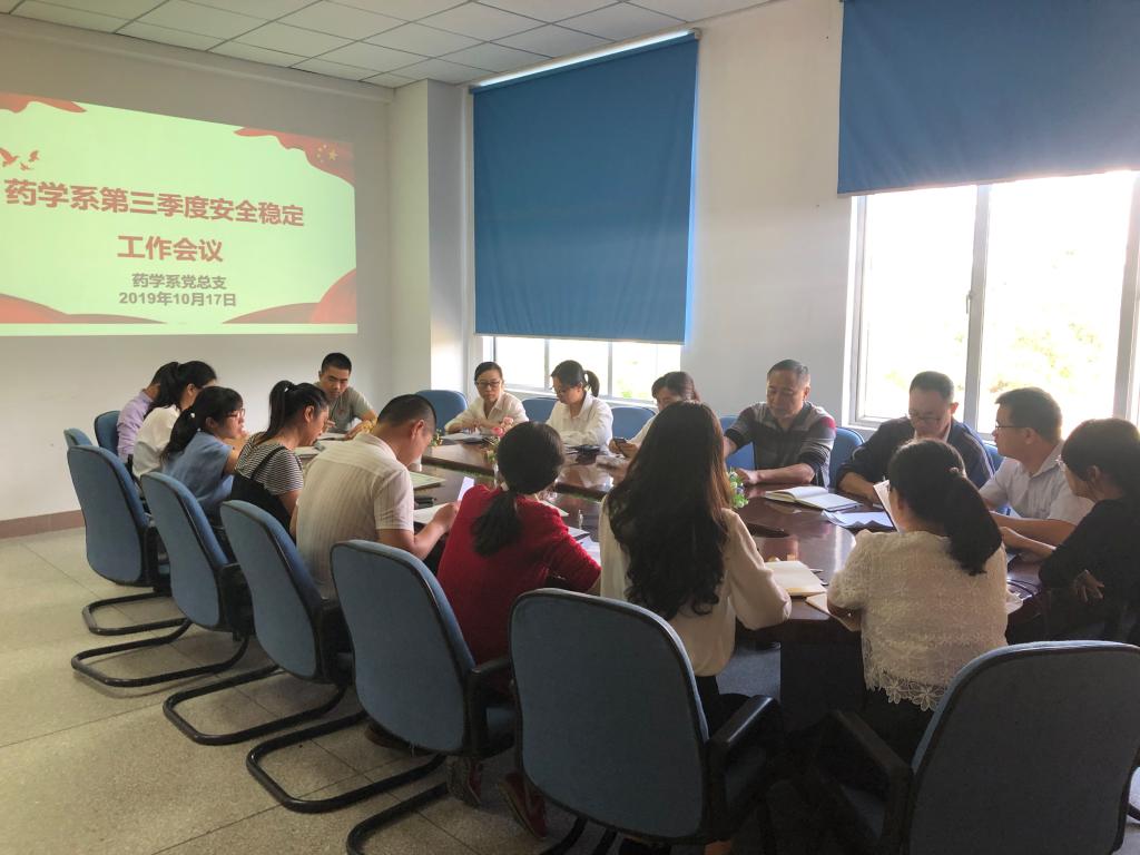 2019年10月17日,藥學(xué)系黨總支在系部會(huì)議室召開(kāi)第三季度安全穩(wěn)定工作會(huì)議。藥學(xué)系黨總支書(shū)記鄭力宏、副主任(主持工作)肖健、黨總支副書(shū)記賴文金、副主任潘雪豐、總支委員、各支部書(shū)記、教研室主任、實(shí)訓(xùn)中心主任及全體輔導(dǎo)員到場(chǎng)參會(huì),會(huì)議由黨總支書(shū)記鄭力宏主持。