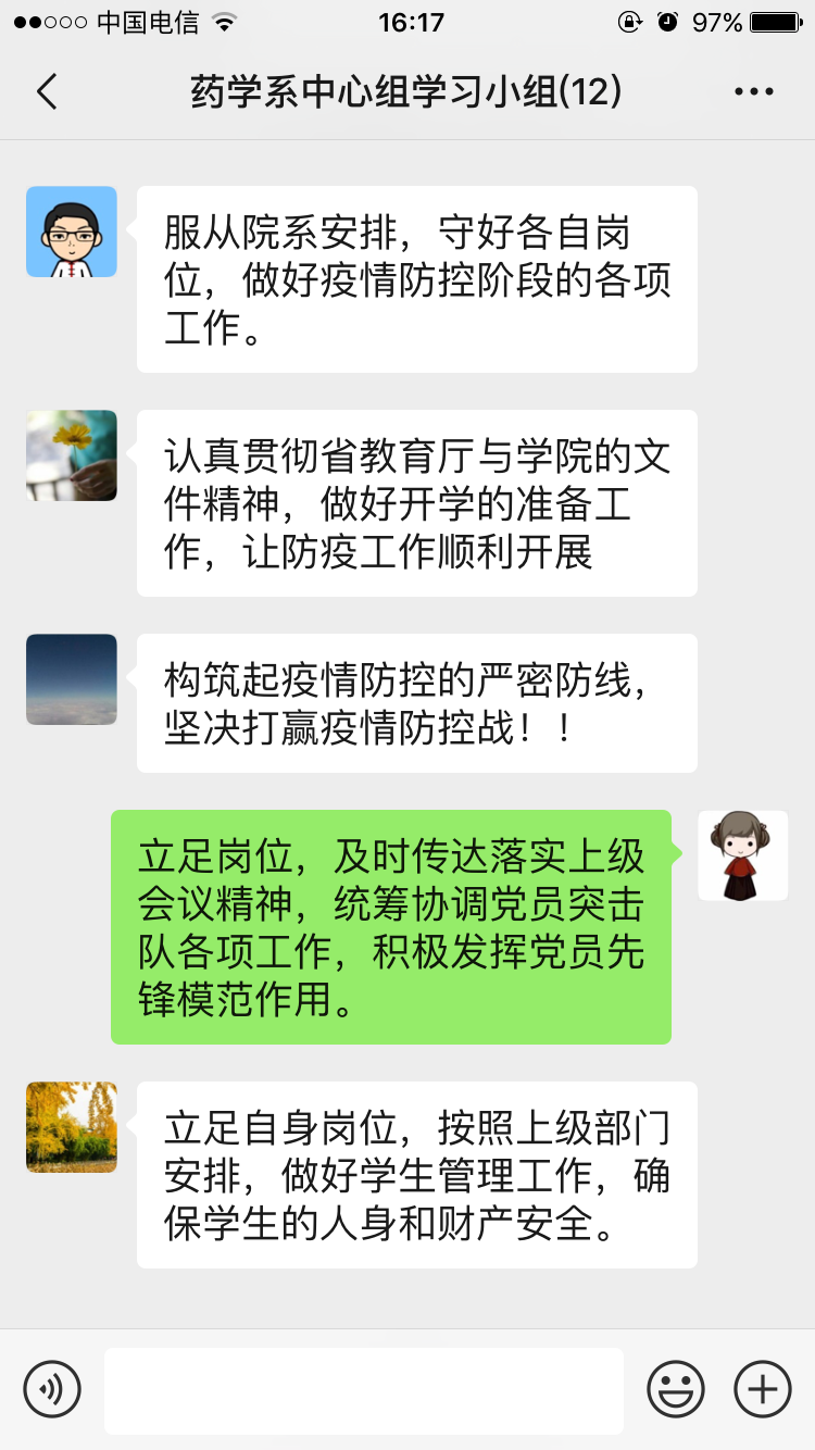 2020年2月20日,藥學(xué)系黨總支在微信群召開中心組學(xué)習(xí)(擴(kuò)大)會(huì)議,集中學(xué)習(xí)近期省委教育工委以及學(xué)院關(guān)于疫情防控工作的相關(guān)決策部署,會(huì)議由藥學(xué)系黨總支書記鄭力宏主持。