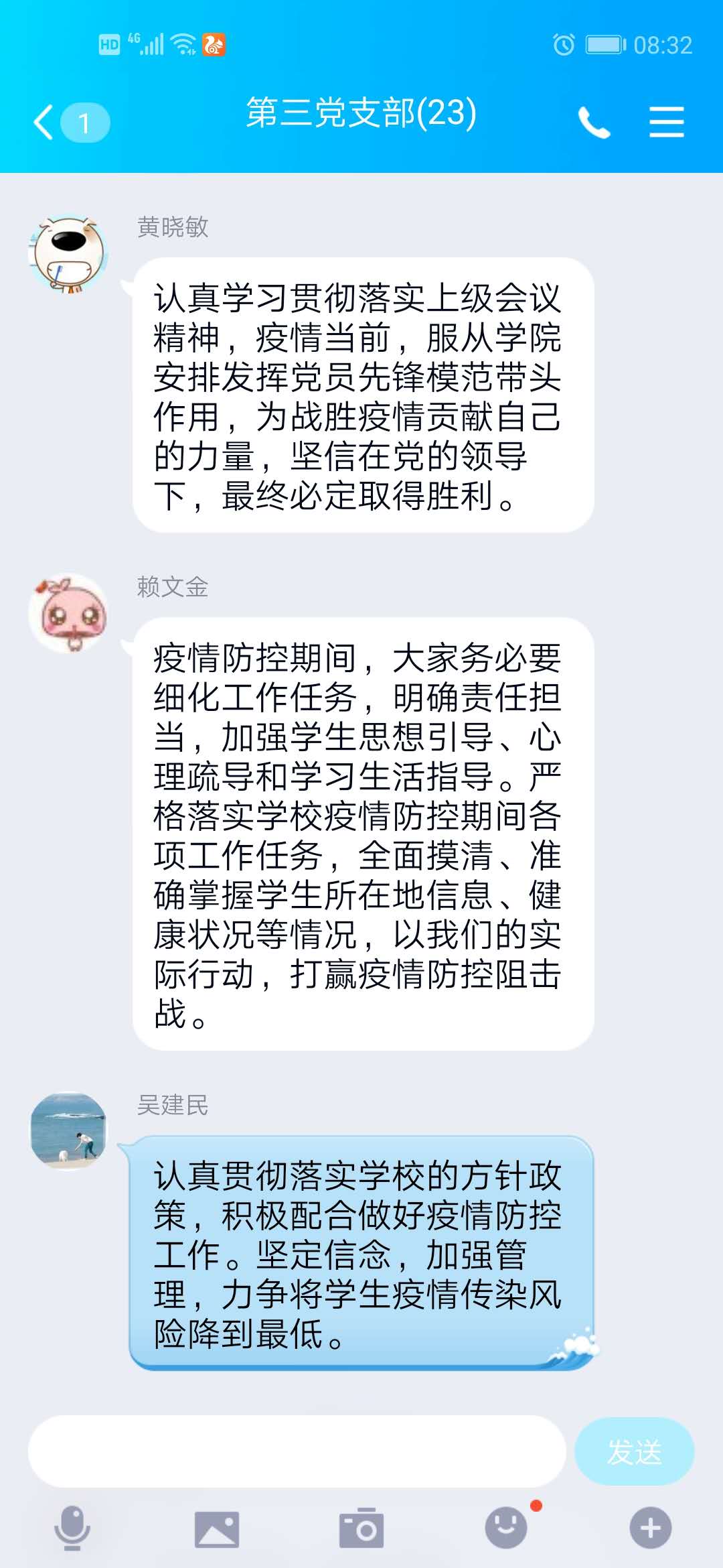 2月20日,藥學(xué)系學(xué)生黨支部以QQ群為載體,通過線上語(yǔ)音集中學(xué)習(xí)福建省教育廳《關(guān)于引導(dǎo)高校師生有序返校的通知》及《福建衛(wèi)生職業(yè)技術(shù)學(xué)院新型冠狀病毒肺炎疫情防控工作方案》等兩份文件精神。
