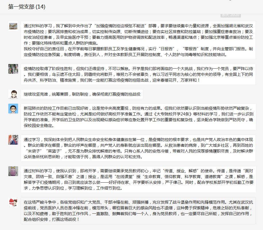 黨員同志表示通過材料的學(xué)習(xí),認(rèn)識(shí)到新冠肺炎的防控工作目前呈現(xiàn)向好趨勢(shì),但我們依然要清醒認(rèn)識(shí)到當(dāng)前疫情形勢(shì)依然嚴(yán)峻復(fù)雜,防控工作依然不能有絲毫放松,尤其是如何做好學(xué)院開學(xué)前后準(zhǔn)備工作。通過《大專院校開學(xué)24條》等材料的學(xué)習(xí),我們進(jìn)一步認(rèn)識(shí)到開學(xué)前的準(zhǔn)備、開學(xué)后的衛(wèi)生防護(hù)以及出現(xiàn)疑似感染癥狀等應(yīng)急處置開學(xué)工作的重要性和復(fù)雜性,作為黨員,我們將堅(jiān)決配合學(xué)院做到嚴(yán)防死守,確保校園安全穩(wěn)定。