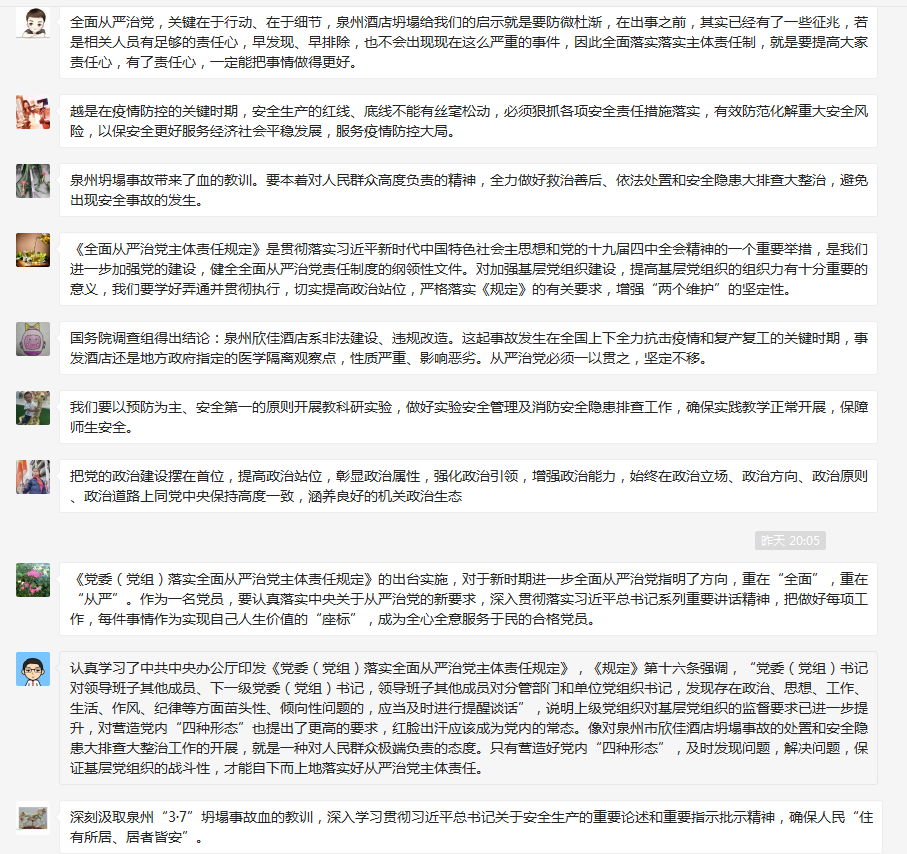 與會(huì)同志結(jié)合個(gè)人崗位實(shí)際交流心得,大家紛紛表示將深刻汲取泉州3·7”坍塌事故血的教訓(xùn),以案示警中受警醒、明法紀(jì),不僅如此,深入學(xué)習(xí)貫徹習(xí)近平總書記關(guān)于全面從嚴(yán)治黨重要論述,立足崗位,嚴(yán)格落實(shí)、積極為院系做貢獻(xiàn)。