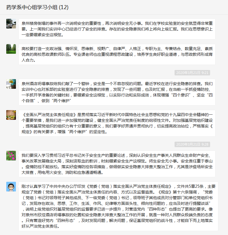 2020年3月21日,藥學系黨總支在微信群召開中心組學習(擴大)會議,會議由藥學系黨總支書記鄭力宏主持。