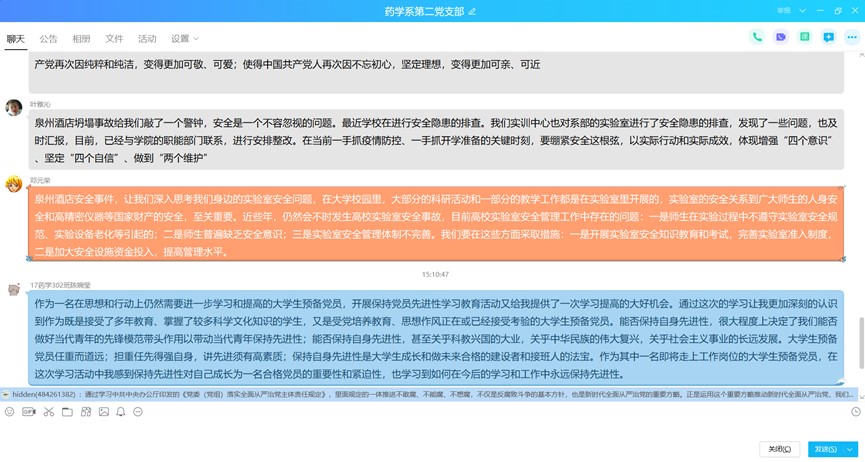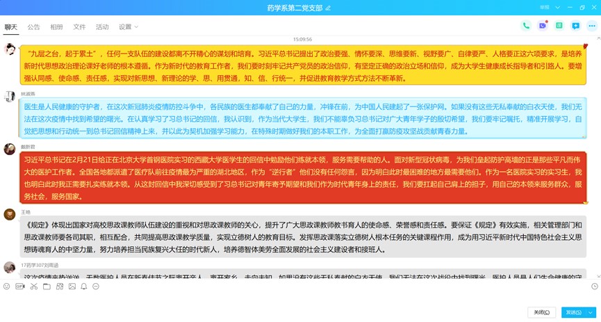自主學習后,鄧元榮同志在支部微信群中組織視頻連線,支部黨員圍繞學習內(nèi)容紛紛發(fā)表學習感想。潘雪豐同志強調(diào)了按照“價值引領、能力本位、知識教育”總體要求,深化課程思政教學改革的重要性。廖偉堅同志則從從嚴治黨出發(fā),必須增強政治意識、大局意識、核心意識、看齊意識,自覺維護黨中央權威和集中統(tǒng)一領導,自覺在思想上政治上行動上同黨中央保持高度一致。