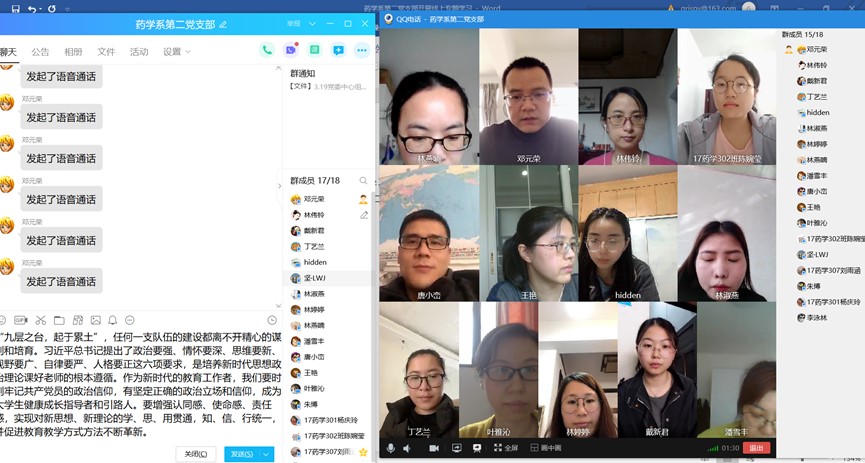 3月19日,藥學系第二黨支部全體成員準時上線,在支部書記鄧元榮同志的組織下開展線上專題學習。此次專題學習主要圍繞《習近平總書記在決戰(zhàn)決勝脫貧攻堅座談會上的講話》、《習近平總書記給首鋼醫(yī)院實習的西藏大學醫(yī)學院學生的回信》、《教育部辦公廳關于學習宣傳和貫徹實施<新時代高等學校政治理論課建設隊伍規(guī)定>的通知》等七份材料展開。
