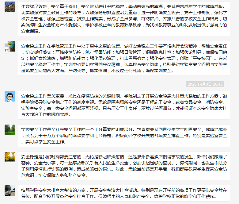 會上,鄭力宏書記首先傳達了學院2020年第一季度安全穩(wěn)定工作會議精神,并組織大家集體學習了《福建衛(wèi)生職業(yè)技術(shù)學院關(guān)于開展安全隱患大排查大整治的工作方案》,與會人員結(jié)合學習內(nèi)容發(fā)表個人學習心得。系副主任(主持工作)肖健強調(diào)我們要按照學院安全大排查大整治的方案,開展安全整治大排查活動。特別是現(xiàn)在開學前的各項工作更要以安全放在首位,配合學校開展各種安全排查工作,保障師生的人身和財產(chǎn)安全,維護學校正常的教學和工作秩序。系實訓中心主任葉雅沁指出,實訓中心將切實貫徹會議精神,認真排查安全隱患,特別是對實驗室安全問題與實驗室建筑安全問題兩大方面,嚴防死守、抓實落細,不放過任何死角,確保實訓安全。