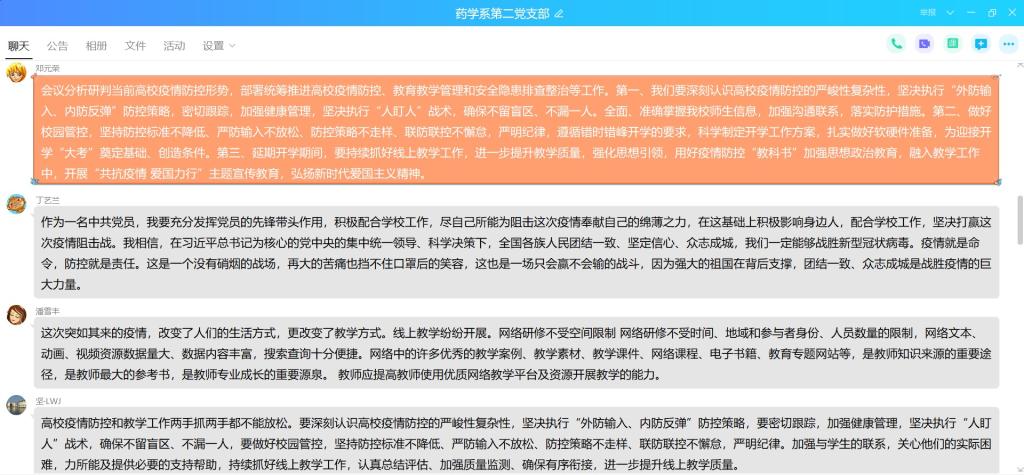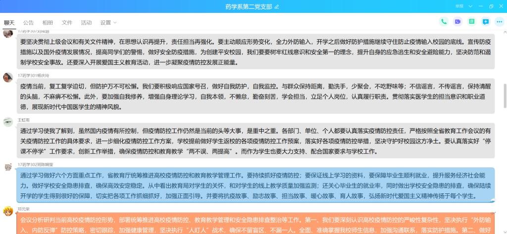 為了加深對(duì)疫情防控工作嚴(yán)峻性的認(rèn)識(shí),進(jìn)一步做好疫情防控期間線上教育教學(xué)管理工作,2020年4月3日,藥學(xué)系第二黨支部組織全體成員在微信群學(xué)習(xí)福建省教育廳統(tǒng)籌推進(jìn)高校疫情防控和教育教學(xué)管理工作視頻會(huì)議精神。