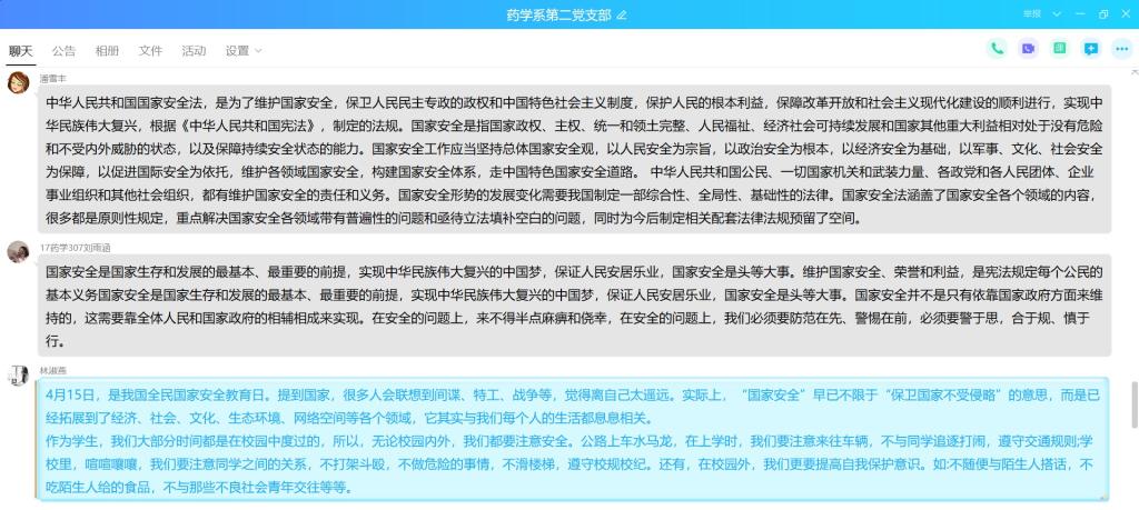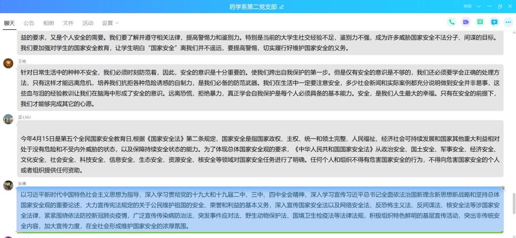2020年4月14日,為了進(jìn)一步貫徹落實習(xí)近平總書記提出的“總體國家安全觀”,增強全體黨員的國家安全意識,藥學(xué)系第二黨支部在微信群開展國家安全教育日線上專題學(xué)習(xí)。