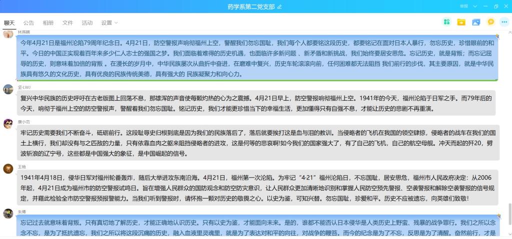 2020年4月21日是福州淪陷79周年紀(jì)念日,防空警報(bào)響徹福州的上空。為了銘記這段屈辱的歷史,珍惜今天這來之不易的和平,藥學(xué)系第二黨支部于4月23日開展“勿忘國恥 珍惜和平”線上主題黨日活動(dòng)。