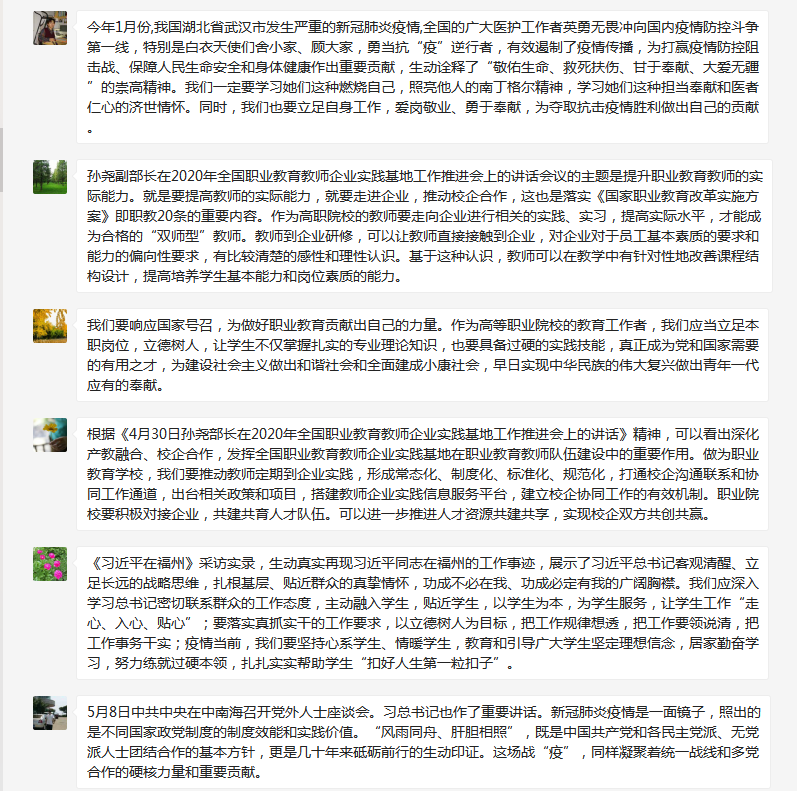 會上,中心組成員集中學(xué)習(xí)了《4月30日孫堯部長在2020年全國職業(yè)教育教師企業(yè)實踐基地工作推進(jìn)會上的講話》、《習(xí)近平在福州(五)》、《習(xí)近平在福州(六)》、《習(xí)近平總書記在黨外人士座談會上的講話》等內(nèi)容。學(xué)習(xí)過程中,各成員立足崗位實際,發(fā)表心得體會。何舒瀾同志指出孫堯副部長在 2020 年全國職業(yè)教育教師企業(yè)實踐基地工作推進(jìn)會上的講話突出了一個實字,為“雙師型”教師隊伍的培養(yǎng)指出了明確的方向,高職教師中的“雙師”并不能只是具有雙證的教師,而應(yīng)該是真正有技術(shù)的,能勝任企業(yè)工作崗位的真正“雙師”。鄧元榮同志表示通過學(xué)習(xí)《習(xí)近平在福州》采訪實錄,我們深切地體會到了習(xí)近平總書記視群眾為親人的為民情懷和“馬上就辦、真抓實干”等優(yōu)良作風(fēng),對共產(chǎn)黨人的初心和使命有了更真切、更深刻的感悟,也深切地感受到習(xí)近平總書記對福州建設(shè)的高度重視,他的大局觀和系統(tǒng)思維對開發(fā)區(qū)高質(zhì)量發(fā)展具有戰(zhàn)略性、前瞻性指導(dǎo)意義。