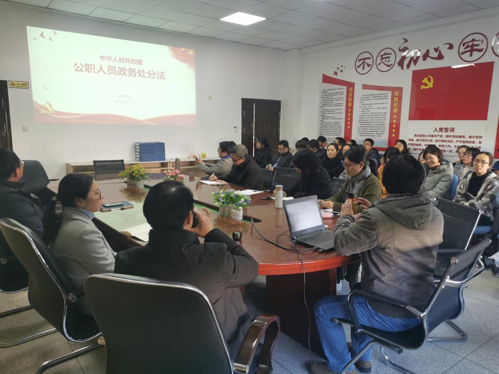2021年1月14日,藥學(xué)院組織全體教職工在會議室開展《中華人民共和國公職人員政務(wù)處分法》專題學(xué)習(xí),會議由藥學(xué)院黨總支副書記賴文金主持。