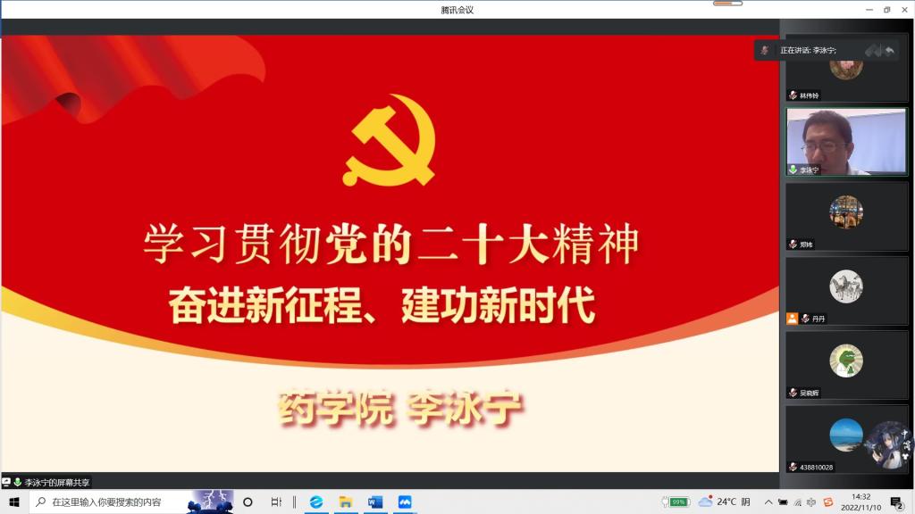 為了進(jìn)一步學(xué)習(xí)好、宣傳好、貫徹好黨的二十大精神,準(zhǔn)確黨的二十大精神實(shí)質(zhì),藥學(xué)院副院長(zhǎng)李泳寧于2022年11月10日以“奮進(jìn)新征程 建功新時(shí)代”為主題為支部黨員帶來(lái)一堂精彩的黨課。