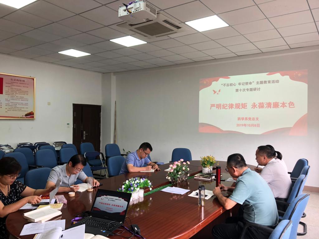 10月8日下午,藥學(xué)系黨總支在系部會(huì)議室開(kāi)展主題為“嚴(yán)明紀(jì)律規(guī)矩,永葆清廉本色”專題學(xué)習(xí)研討交流會(huì)。藥學(xué)系黨總支書(shū)記鄭力宏主持會(huì)議,藥學(xué)系副主任肖?。ㄖ鞒止ぷ鳎?、黨總支副書(shū)記賴文金、副主任潘雪豐及各黨支部書(shū)記參加了本次研討交流會(huì)。