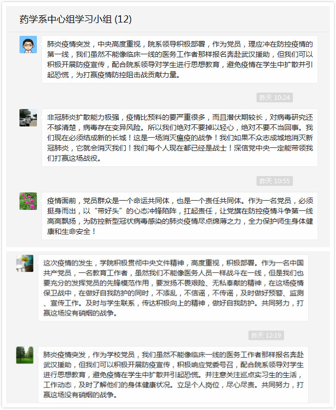通過(guò)學(xué)習(xí),藥學(xué)系全體師生紛紛表示面對(duì)疫情,將堅(jiān)定必勝信心,在做好自我防護(hù)的同時(shí),堅(jiān)決做到不造謠、不傳謠、不信謠。藥學(xué)系黨總支書記鄭力宏強(qiáng)調(diào):我們要堅(jiān)信在黨中央的集中統(tǒng)一領(lǐng)導(dǎo)下,定能打贏防控疫情阻擊戰(zhàn),作為一名教育工作者,在突如其來(lái)的疫情面前,雖然我們不能像醫(yī)務(wù)人員一樣戰(zhàn)斗在一線,但我們可以積極開展防疫宣傳,配合院系領(lǐng)導(dǎo)對(duì)學(xué)生進(jìn)行思想教育,避免疫情在學(xué)生中擴(kuò)散并引起恐慌,特別是黨員同志,必須挺身而出,以“帶好頭”的心態(tài)沖鋒陷陣,扛起責(zé)任,為防控新型冠狀病毒感染的肺炎疫情盡點(diǎn)綿薄之力,全力保護(hù)師生身體健康和生命安全!