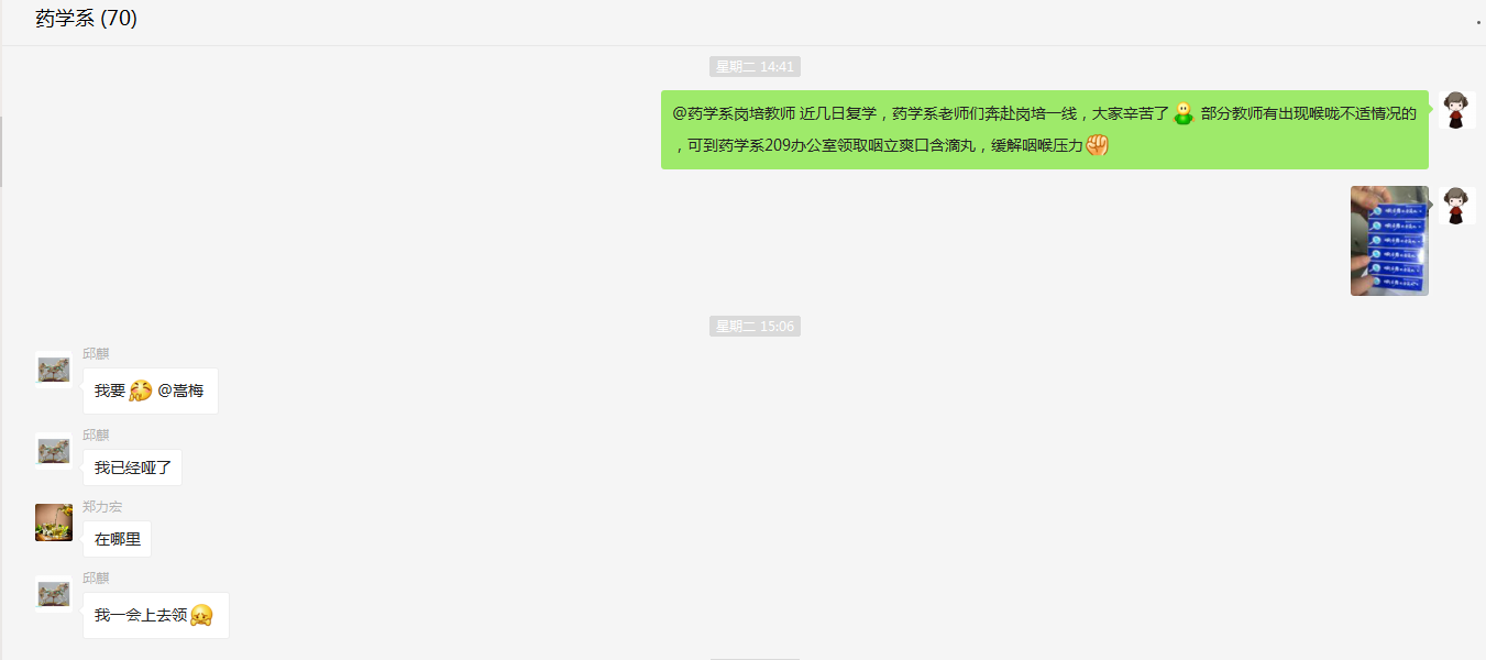 6月9日,在藥學(xué)系的QQ群和微信群中,組織員黃嵩梅發(fā)了這樣一條消息,“近幾日復(fù)學(xué),藥學(xué)系老師們奔赴崗培一線,大家辛苦了。部分教師有出現(xiàn)喉嚨不適情況的,可到藥學(xué)系209辦公室領(lǐng)取咽立爽口含滴丸,緩解咽喉壓力”。簡(jiǎn)單一句暖心的話語(yǔ),飽含藥學(xué)系黨總支關(guān)心、關(guān)愛(ài)、關(guān)切教職工的濃濃深情;一顆顆含在嘴中的滴丸,感慨系之,潤(rùn)心沁肺。