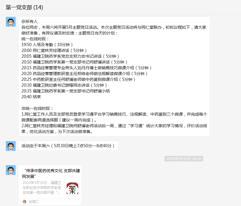 為更好弘揚(yáng)中醫(yī)藥傳統(tǒng)文化,增強(qiáng)黨員同志對(duì)中醫(yī)藥傳統(tǒng)文化的了解和認(rèn)同,5月30日,藥學(xué)系第一黨支部與北京同仁堂健康藥業(yè)連鎖有限公司支部黨員通過騰訊會(huì)議開展“傳承中醫(yī)藥傳統(tǒng)文化,支部共建同發(fā)展”主題黨日活動(dòng),校企黨員同志在線開展學(xué)習(xí)交流,活動(dòng)由支部書記何舒瀾主持。