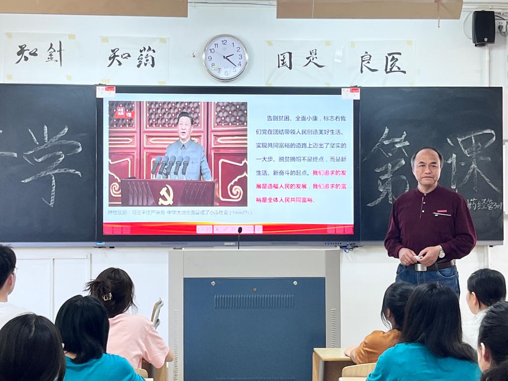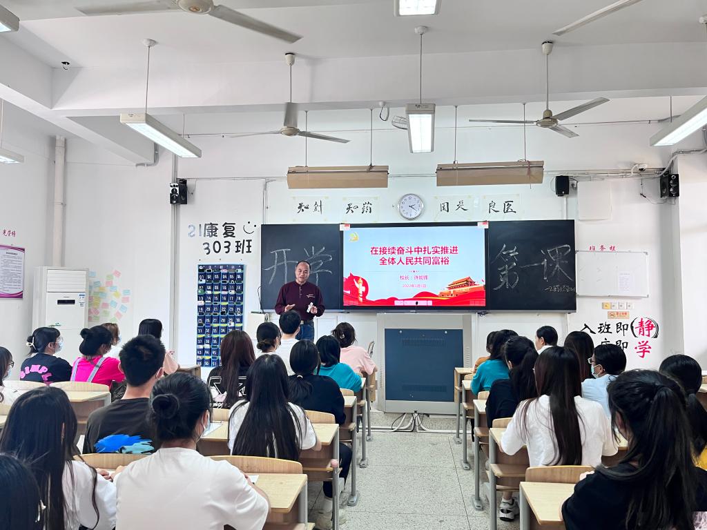 為深入學習貫徹習近平總書記關于“共同富?!毕盗兄匾撌?,激勵大學生扛起守好“紅色根脈”的時代責任,5月5日下午,校長許能鋒以“在持續(xù)奮斗中扎實推進全體人民共同富?!睘橹黝},為藥學院學生講授“開學第一課”。