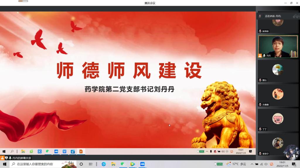 為了進(jìn)一步學(xué)習(xí)貫徹黨的二十大精神,提升黨員教師的思想政治素質(zhì)和職業(yè)道德水平,2022年11月5日,藥學(xué)院第二黨支部書記劉丹丹在線上圍繞師德師風(fēng)建設(shè)為支部黨員帶來(lái)了一堂精彩的黨課。