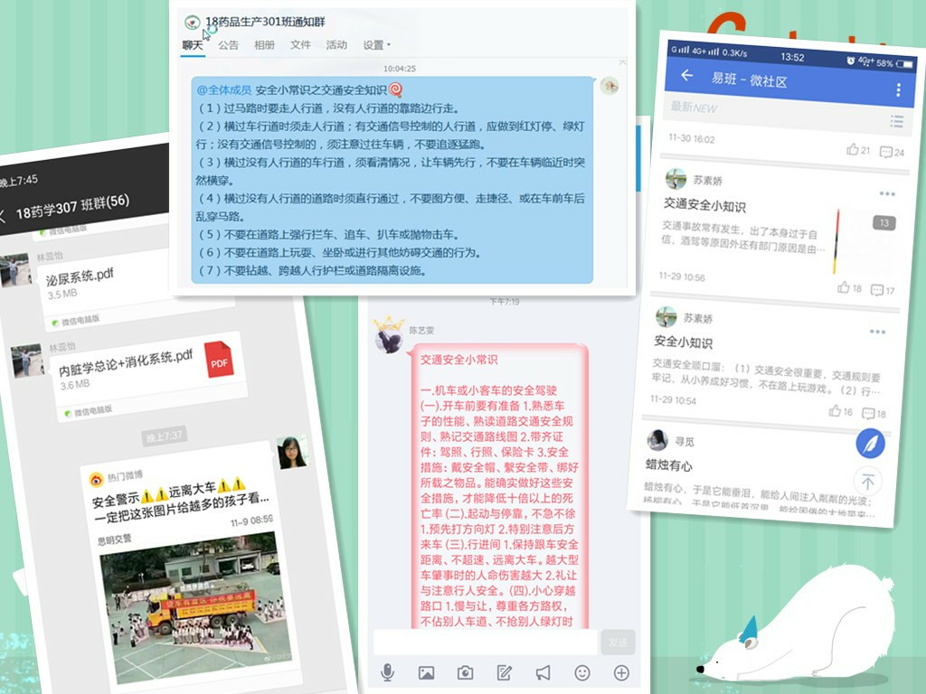 班會上,各班輔導員結合近期學院學生返校途中發(fā)生的交通安全事故以及一些生命安全相關的真實案例,對學生進行安全教育,帶領學生學習交通安全知識,強調做好安全文明出行的每個細節(jié)。此外,還通過班級QQ群、微信群、易班平臺等發(fā)送交通安全小知識。