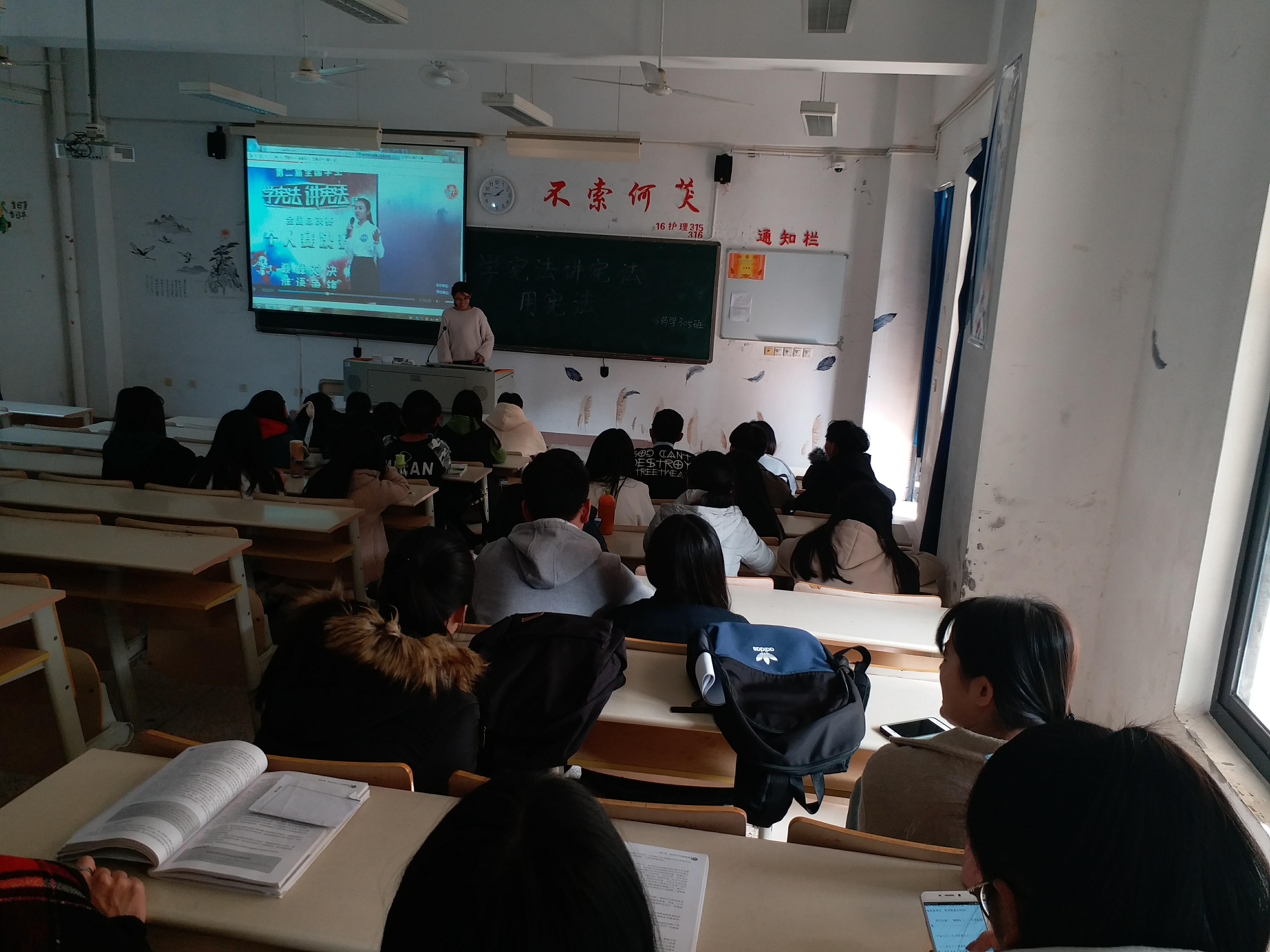 在這期間,藥學系廣泛發(fā)動各班級深入開展了學憲法、講憲法、守憲法、用憲法主題班會,各班以多種形式開展主題班會,比如說組織學生觀看法制教育視頻及中央電視臺團隊賽“學憲法將憲法”的總決賽,也有讓學生上臺分享自己身邊的守憲法的小故事,談自己學習憲法的感受等等,讓學生從真正意義上了解國家的根本大法。