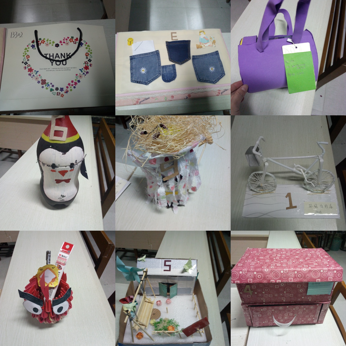 個性的造型、環(huán)保的利用、溫馨的裝飾、五花八門的創(chuàng)意在我系學(xué)生作品中展現(xiàn)的淋漓盡致。各個作品獨具特色,精致的創(chuàng)意手工吊燈、俏皮可愛的企鵝寶寶、美觀實用的儲物盒展現(xiàn)了同學(xué)們的動手能力、環(huán)保意識,以及參與系部活動的積極性。最終,評委根據(jù)評分標(biāo)準(zhǔn)對各作品進行打分,最終13502宿舍以獨特的造型和環(huán)保的理念獲得一等獎;10304、13302宿舍以巧妙的構(gòu)思獲得二等獎;三等獎分別花落13503、13601及13402宿舍;獲得優(yōu)秀獎的宿舍分別為10204、10504及13301;而10104則斬獲了最佳創(chuàng)意獎。