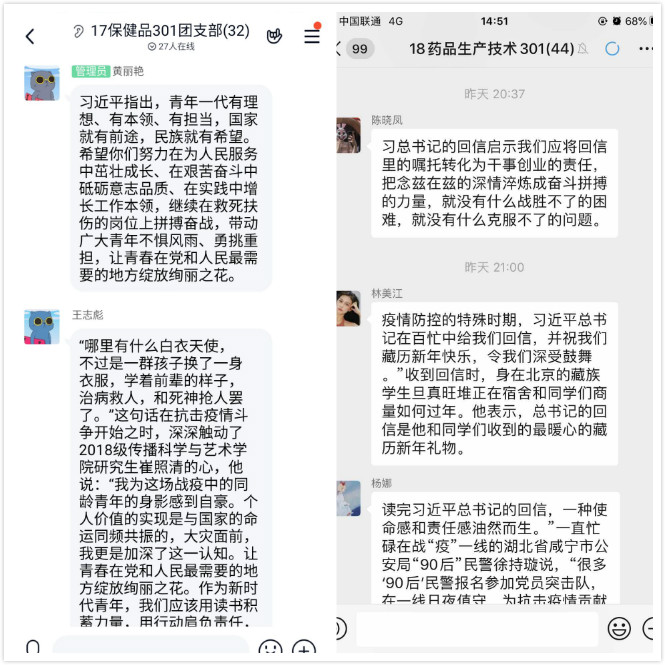 315日,習近平總書記給北京大學援鄂醫(yī)療隊全體“90后”黨員的回信,向他們和奮斗在疫情防控各條戰(zhàn)線上的廣大青年致以誠摯的問候。習近平總書記暖心的話深深感染著中國青年,我系青年學子也備受鼓舞,藥學系團總支組織各班團支部通過學習貫徹習近平總書記重要回信精神,希望用實際行動踐行新時代青年的責任與擔當。