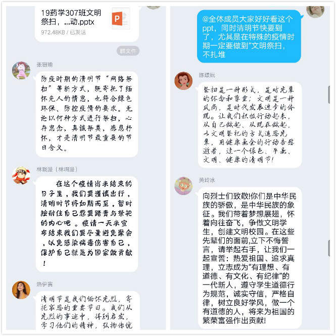 本次活動面向全系青年團員,共計42個團支部參與其中,各團支部圍繞主題,分別以PPT講解、趣味互動、觀看英雄事跡視頻、QQ微信群討論等多種形式展開。其中18藥學307班團支部主要以語音在線解答和討論方式展開會議,就疫情期間不可擅自移動位置問題進行了強調(diào),同時提醒同學們要繼續(xù)做好個人防護;19藥學307班團支部則以PPT解讀方式積極倡導同學們進行網(wǎng)上祭奠,以此來追憶先烈,號召各位同學緬懷英烈,繼承英烈遺志,傳承民族精神。