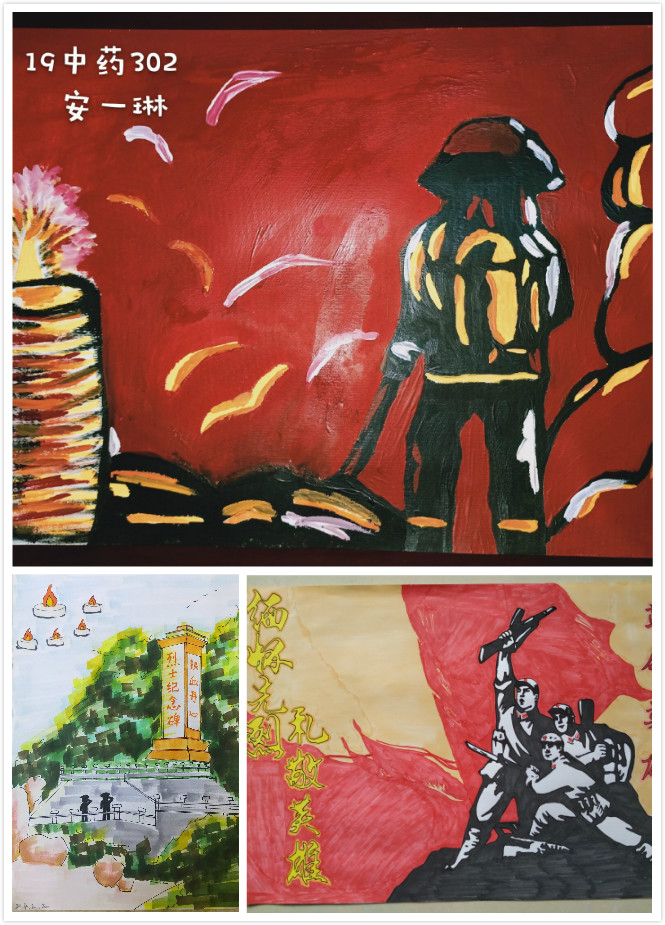 本次活動(dòng)得到了我系學(xué)子的熱切關(guān)注和積極響應(yīng),同學(xué)們紛紛利用網(wǎng)絡(luò)、書籍等收集資料,充分發(fā)揮想象力與創(chuàng)造力,把對(duì)英雄們的敬意融入作品中,運(yùn)用畫筆向英烈與抗疫英雄致敬,呈現(xiàn)出了許多主題鮮明、設(shè)計(jì)新穎、內(nèi)容豐富的作品。經(jīng)評(píng)選,18中藥301班胡曉茹榮獲一等獎(jiǎng);18藥經(jīng)管302班曾小天、19藥學(xué)307班黃劍花榮獲二等獎(jiǎng);18藥經(jīng)管302班熊慶玲、18藥學(xué)301班陳焙焙、18中藥301班楊美娟榮獲三等獎(jiǎng);18中藥301班莊晶晶 、19藥經(jīng)管302班林筱芮、19藥學(xué)302班王思涵、19中藥學(xué)302班安一琳榮獲優(yōu)秀獎(jiǎng)。