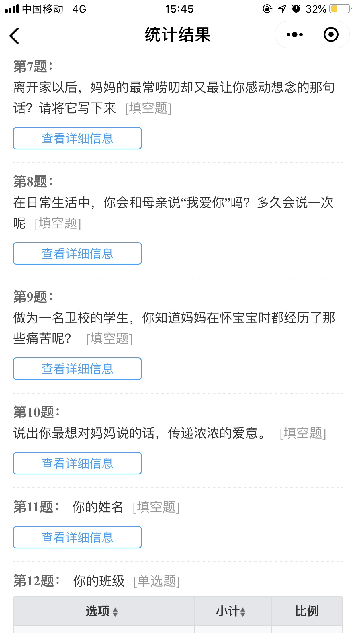本次問卷共有12題,全部為填空題,共回收了580份問卷,有效回收率達98%。調(diào)查顯示:90%以上的學生知道母親節(jié)時間;90%的學生認為母親節(jié)很重要;70%的學生記得母親的生日;60%的學生會在母親節(jié)送禮物; 50%每的學生會每周至少主動聯(lián)系母親一次;80%的學生能說出母親懷孕時所經(jīng)歷的痛苦;20%的學生曾對母親說過“我愛你”;80%的學生在調(diào)查最后中最想對母親說出“我愛你”。