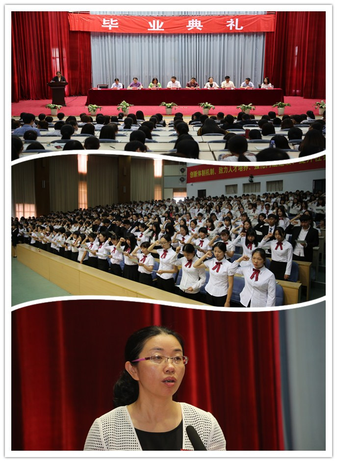 畢業(yè)典禮在莊嚴(yán)的國(guó)歌中拉開(kāi)帷幕。教務(wù)處姜華萍副處長(zhǎng)宣讀了畢業(yè)生名單,學(xué)工處宋維副書(shū)記宣讀了優(yōu)秀畢業(yè)生名單和優(yōu)秀實(shí)習(xí)生名單。與會(huì)領(lǐng)導(dǎo)為畢業(yè)生代表、優(yōu)秀畢業(yè)生及優(yōu)秀實(shí)習(xí)生頒發(fā)證書(shū)。接著由李寶珠老師領(lǐng)誓,全體畢業(yè)生莊嚴(yán)宣讀了醫(yī)學(xué)生誓詞。隨后,畢業(yè)生代表曾佳佳、邱玥星發(fā)言,他們總結(jié)了三年來(lái)所學(xué)知識(shí)和技能,深切表達(dá)對(duì)學(xué)院領(lǐng)導(dǎo)、老師的感激之情和對(duì)同學(xué)、朋友的不舍之情,以及即將踏上社會(huì)的堅(jiān)定信心。王燕老師代表全體教師表達(dá)了對(duì)畢業(yè)生們的關(guān)心和殷切希望。