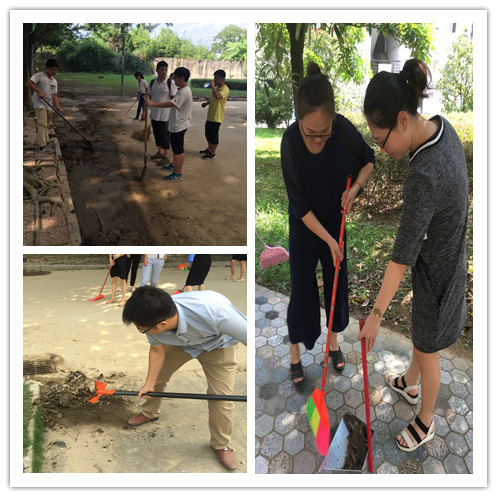 藥學(xué)系三個黨支部書記帶領(lǐng)全體黨員教師與學(xué)生一起,在藥學(xué)系大樓、明湖餐廳、10、11、12、13號樓四周開展災(zāi)后大掃除工作。大家頂著烈日,有條不紊地進(jìn)行分工合作,清掃衛(wèi)生死角、擦洗垃圾桶、擦除護(hù)欄上的“野廣告”等。尤其是學(xué)生宿舍13號樓淤泥很多,在黨員教師的帶動下,16級新生班級學(xué)生用鐵鏟清除大量淤泥,用板車把垃圾運(yùn)到田徑場垃圾場。經(jīng)過大家近一個小時的艱苦奮戰(zhàn),藥學(xué)系包干區(qū)的環(huán)境衛(wèi)生得到大大改觀。