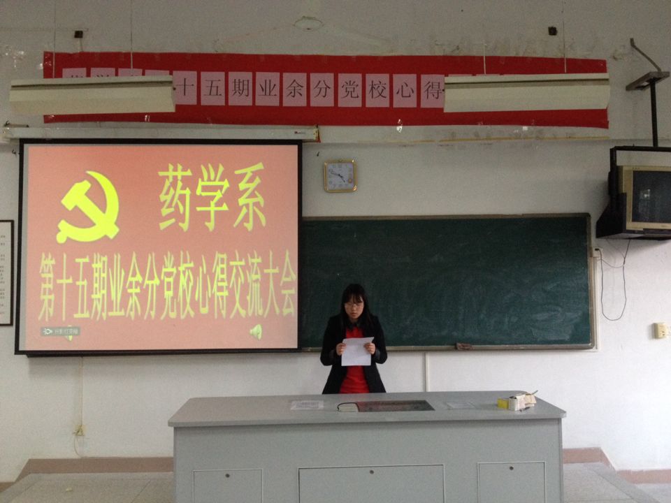 12月16日下午4:20,藥學(xué)系于系部二階開(kāi)展藥學(xué)系第十五期業(yè)余分黨校心得交流大會(huì)。蒞臨本次大會(huì)的領(lǐng)導(dǎo)以及老師分別是:藥學(xué)系團(tuán)總支副書(shū)記李寶珠老師,輔導(dǎo)員胡丹老師,黃嵩梅老師。