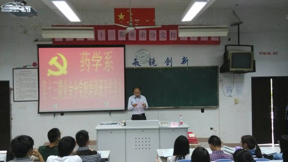 大會在莊嚴的國歌中拉開序幕。首先,藥學系第一黨支部書記葉雅沁老師為我們宣讀了黨校的有關通知,緊接著藥學系第三黨支部書記陳潔老師宣布黨校學員名單,然后,學員代表上臺發(fā)言。最后,由藥學系黨總支書記蘇愛華書記做重要講話,他提出了黨課的重要性,學員要有奉獻精神,起模范帶頭作用,要認真學習,積極向黨組織靠攏,并希望同學們共同努力,以優(yōu)異的成績從黨校中畢業(yè),能夠爭取早日加入中國共產黨。
