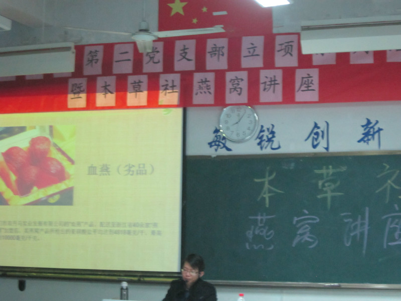 2013年3月7日晚上7:30,為豐富藥學(xué)系學(xué)生會(huì)本草社社團(tuán)活動(dòng)內(nèi)容,提升本草社社員們的專業(yè)素養(yǎng),藥學(xué)系第二黨支部、藥學(xué)系學(xué)生會(huì)本草社在藥學(xué)系第一階梯教室聯(lián)合舉辦首場專業(yè)講座——《燕窩的采收與鑒定》。本次講座的主講人是藥學(xué)系第二黨支部書記、中藥教研室的何舒瀾老師。通過何舒瀾老師由淺入深、圖文并茂的講演,廣大社員對(duì)燕窩的來源、形成、采收、分級(jí)、真?zhèn)蝺?yōu)劣鑒定及食用方法等方面都有了新的認(rèn)識(shí),拓展了視野,豐富了專業(yè)知識(shí),也提高了社員們的養(yǎng)生保健意識(shí)。講座后本草社長李明俊和系社團(tuán)部長林雨頭同學(xué)針對(duì)講座開展的形式和內(nèi)容征求了社員們的意見,大家普遍感覺收獲不小,激發(fā)了學(xué)習(xí)中藥知識(shí)的熱情,希望以后類似講座能多多開展。
